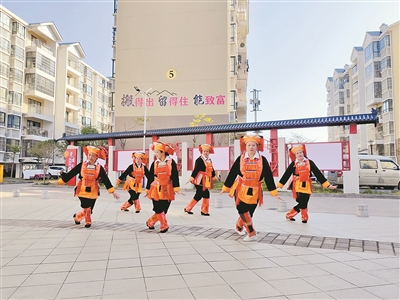 11月8日,在永福县最大的易地扶贫搬迁安置点坪岭安置小区广场上,瑶族同胞跳起欢快的瑶族舞蹈。