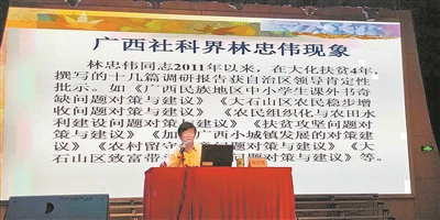 陈教授介绍,2008年至2012年,林忠伟连续4年担任广西社科院驻大化瑶族自治县新农村建设指导员,除了认真履行为贫困村建水柜、学校、村道、敬老院、村委办公楼等基础设施的工作职责外,按照自治区党委组织部要求当好村情民意调研员、政策法规宣传员、富民强村服务员、矛盾纠纷调解员、制度建设督导员“五员”,利用当指导员的有利时机,自费走访了该县36个贫困村,还踏遍了广西80多个县不计其数的贫困村。有时候,为了调研特定地区和案例,林忠伟还跑到广东,上山下乡,进村入户,走访众多的基层干部和群众家庭,获得真实详尽而丰富多样的第一手材料。从农村走出来的林忠伟深怀一颗回报农民的感恩之心,具有强烈的社会责任感。他一篇篇关注现实生活和饱含时代气息的咨政研究报告,一个个充满智慧和才气的见识与观点,都来自长期的扶贫工作实践,沾满泥土的芬芳。