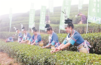 2月3日,三江侗族自治县举行2021年早春茶采摘仪式,当地群众以采摘春茶比赛、茶艺展示、手工炒茶等形式演绎侗乡茶文化。
