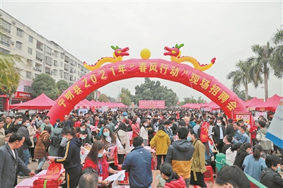 ▲2月19日,宁明县举办2021年“春风行动”企业用工现场招聘会,吸引3500多名群众前来参加招聘会。