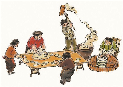 缺吃的年代,过年期间才能享受到一些美食,才真正知道肚饱的幸福。年三十晚得把糍粑打好。因为是蒸熟的糯米来打,糯饭很稠很黏,必须两个大力士各使用一根粑棒配合着来舂,上下轮流,互舂粑棒,打一窠下来,往往手掌起泡,大汗淋漓。我家糯米最糟糕,可能是品种问题,根本打不烂,无论怎样打,米都还是成粒的。没办法,只能勉强捏出个形状来,人称“青冈粑”,难看又不好吃。大哥曾当礼物拿去拜年,还被人笑话。从粑棒上取下糍粑也得讲究技巧,父亲是行家。只见他用茶油把手沾湿,迅速摘下一个一个小团,旁边的人趁热一齐帮忙捏成粑形,放到簸箕里晾干。这时每人可以吃到一个有红糖馅的热糍粑。第二天以后,就只能烧着吃或烙着吃了。拜年或回礼,糍粑是不可或缺的礼物。另外一种美食就是汤圆。那时我们吃不到糯米粉做的汤圆,只有糯玉米做的,口感比较硬。因为用红糖或白砂糖来煮,有甜味,大家都很喜欢。平时都没吃过早餐,只有正月十五这天能够用糍粑和汤圆做早餐,已算是神仙生活了。