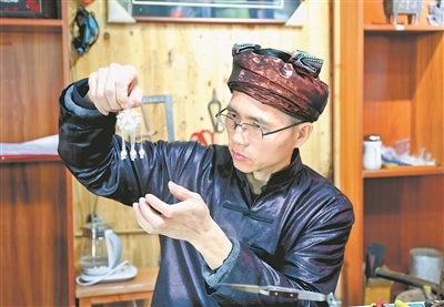 “我跟马师傅学习银饰锻造技艺已经有四年了,马师傅教我很细致、很认真,他毫无保留地把技术传给了我。”马贵兵徒弟马彦彪说道。