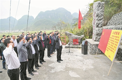 3月19日,罗城仫佬族自治县在四把镇红七军佛子坳战斗遗址举行县四家班子领导党史学习教育“打卡红色教育基地”现场教学活动,接受红色洗礼、重温入党誓词、感悟初心使命。