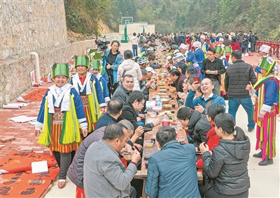 槽碓村全村人口1342人,2015年底精准识别时全村的贫困发生率高达59.1%,2017年底仍有53.93%。2018年,时任中共中央政治局常委、国务院副总理汪洋对《瑶族支系土瑶群众深度贫困状况亟待扭转》一文作出批示,槽碓村紧紧抓住机遇,在各级各部门的倾力帮扶下撸起袖子加油干,立下“一年初见成效、二年大见成效、三年脱贫摘帽”的铿锵承诺,将各级投入的资金2740.9万元用在刀刃上,实施道路、桥梁、安全防护、饮水、通信等项目23个,破除发展瓶颈,将攻坚蓝图上的规划由纸上落实到地上,村党支部、村委会班子带领全村瑶族同胞浓墨重彩地在蓝图上描绘出崭新的画卷。
