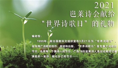 虚 度 虎 牙(壮族) 蛙声一起 万水肃穆 仿佛 倩影一晃 千山和鸣 此时 点点萤火 也能轻拂杨柳 曾经泯灭的声音 次第汹涌而来 面对如此旋律 我会目空一切 也情愿 虚度一生 路 拓 夫(壮族) 前几年修地铁 到处挖马路 堵车成了日常 后来地铁通了 马路还是天天挖 有时候同一段路 前一天刚填好 第二天又开挖 挖呀挖,习惯了 现在开车走到平坦的路上 就想 这路,该挖了吧 龙活着 黄 鹏(壮族) 我抬起头 发现龙活着 彩霞活着 阳光活着 浩大的天空 月亮不寂寞 星星不寂寞 云不寂寞 无垠的大地上 青苗活跃 花朵活跃 人心也活跃 古老的龙 每到今日 都鲜活着 飞入人间烟火 辛丑春分 梁 洪(壮族) 此时此刻 不冷 也不很暖 昨日热气慢慢散去 向南 冷空风正在路上 也向南 此时此刻 行程到半 进退两难 往前一步 天明清朗 若后退半步 乍暖还寒 此时此刻 春天给了自己一个了断 把自己一分两半 一半留在冬天 一半去往夏天 思想的石头 费 城(壮族) 那些贫穷的,忧伤的,面庞清瘦的石头 那些疼痛的,抒情的,十指冰凉的石头 那些沉默的,不说话的,土地上奔跑的石头 都是坐满我内心的,不快乐的石头 今夜,它们都在各自的梦里沉睡 今夜,它们都在各自的故乡怀抱梦想 今夜,没有星光,只有稻叶含香 今夜,没有故乡,只有远方 今夜,只有凉风吹冷的夜晚 一只咯血的鹰,矗立于思乡之石上 沉默不语,像我一样的沉默不语 空瓶子 羽微微 他有许多好看的空瓶子 也许是她 她有许多好看的空瓶子 空瓶子上贴着蓝色的标签 “黄昏时的风” “你的气味” “一只小鸟的叫声” “叶子的影子” 我失手摔碎一只空瓶 跌落在地上 发出清脆的声音 她飞快走过来 也许是他 他飞快地走过来蹲下身子看 抬起头对我说 它,它不在这儿了 我扶了一把 捡别人钱的女人 周统宽(壮族) 到站的公交车 像偷运建筑垃圾的翻斗车 将乘客倒在路边 一个女人眼见向前跌倒 我神速反应上前扶了她一把 她捡起地上的一张十元钱 白了我两眼后扬长而去 离我不远的一个女孩对她妈妈说 那钱是前面那个哥哥掉的 她妈妈拉她过一边 对我露出不屑的神情 我看着那个丢钱的男孩 背着一把琴 将揣紧的一元硬币 投入公交车投币箱 我不知什么时候也被铲上车 我看见每个人都长着苍蝇的复眼 我越看他们越觉得自己垃圾 我看看公交车路线图 该线路车由河东路西开往河西路东 年 猪 又 见(壮族) 暖暖的画面上 七只猪仔排成一列 晒晒太阳 母猪端坐 暖暖地看着它们 我在猪栏外 也暖暖地看着它们 明年的年猪 也该有个着落了 黑白电视 陈 宁 那年,黑头发发育正茂 跨过一条老水沟 穿过一片新桃林 多彩的声音越近越稠 父亲单位的灯光球场 除夕摆出的黑白电视不大 各家各户的目光,射线不一 或近或远队伍庞大 那年,春晚首个露面的美人儿 在黑白电视白的屏幕白得耀眼 从此,一种节日必长的乡愁 月光般扎进内心聚成暗流 今夜,归乡的我搬出打开 尘封屋角数十年的黑白电视 还是白的屏幕美人儿模糊不清 倒是我的鬓发白如荧屏 词语落在伞上, 是清澈的水 湖南锈才 他在画水,画一段桥 画一个白衣美女,画提一把剑的青衣女子 他画山,最好 不画寺、塔 千万不能画胖和尚,拄着拐杖 手持钵盂那种 对了,油纸伞必不可少 一个姓许的药铺伙计站在宣纸外 想起初见 画室外传来女人一声咳嗽 他一惊,没有墨汁了 春 夜 李宗文 不远处猜码的声音 让夜有了不规则的新游戏 一群头发或白或秃的男人 舍不得放弃几罐好茶 烟很懂事 缠绕后半生的话题而不去 不痛不痒 几声略显豪迈又肆意的笑声后 一切又归于平静 谁走在青山一旁的暗暗的旧道 和我说说虫鸣,狐仙 哪怕是身影早已模糊的你也好 三月花 鹿 野 谁提一篮芬芳的花 一篮闪烁的星辰。露水沾衣时 来到人间三月,把美好 在旷野山川,在眉间心上 温柔种下 千年琵琶语 高山流水意 都入住人间三月,开成 提篮里的娇羞 开成梦里的画 我策马扬鞭,遇见三月 马蹄如花 一路迤逦,一路芬芳 春风难画 辗转人间,书写芳华 且为念为梦,且为远方天涯 …… 让白云烂在地里 陈代云 妈妈在地里种了一片白云 每一朵都像是从炊烟中升起 每一朵都像是一首诗 每一朵落在异乡都是泪水 但是妈妈说,今年遇到洪灾了 那就让它们都烂在地里吧 我们真的 没有来到过 李云华(壮族) 我们真的没有来到过 昨天今天明天 无论何时 一朵浪花一露头 就淹没在无数的浪花里 我们并不相识 我们只是不经意间擦肩而过 我们真的没有来到过 风也没有 棕榈树也没有 每一颗晶莹的沙粒也没有 路过的每一个人 都涂满蓝色 我喝下漫天的蓝 海离我很近也很遥远 海离天空很近也很遥远 海离水很近它活在水里 我们真的没有来到过 前世今生未来 无论何时 一千年以前 一万年以后 我们在某一个午后 落在贝壳 竹简或粉色的纸上 被人们触摸 翻阅 花路私语 雅 北 我在那里过得缓慢 在一个春天接着一个春天 那花架下的女孩,珍珠的嘴唇 是湿的,亮的 我仅有的动作,极其小心闪过 唯恐会损坏花粉下的蝴蝶羽翼 哪怕呼吸下,也可能让它撕裂 而黄昏的光影凸显的时候 有时你听到的是低语 或者是私语:“我周围的一切都睡着了” 那缝补我们分离的 只是一枚上下翻飞的针 春 分 桐 雨(仫佬族) 把时间 一半给正方体 一半给长方体 把色彩 一半给红 一半给白 把黑夜 一半给雨水 一半给清风 把白天 一半给花香 一半给鸟