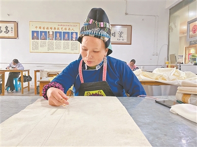 在楼梯口,我见到一个中年妇女,右衣袖耷拉着,她正用铜刀雕刻素莲,仿佛将它雕刻在岁月的深处。在这里,我还看到最美的独臂画娘——王女。7岁的王女,每天由母亲送过来,坐在轮椅上,手握铜刀,神情专注,眼睛干净清澈,没有丝毫的哀怨,在细嫩的光阴里早早地把自己修炼得老成持重。70多岁的蜡染“萨玛”,耳聪目明,不戴眼镜,每天坚持到工作室上班,她是苗族蜡染非遗传承人。目前丹寨有200多个这样的画娘,分布在大山深处,宁航是她们的伯乐,把她们组织起来,让她们的梦想开花。她们的作品,今年还参加了伦敦时装周中国非物质文化遗产蜡染服饰专场秀,好评如潮。这些画娘大多不识字,没上过学,没走出过大山,却能把《诗经》“绿兮衣兮,绿衣黄里”的邻家女孩刻画得典雅大方。