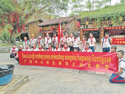 该校学生95%为本地壮族学生,但是仅有30%的学生会壮话,能用壮话交流的只有15%。本次研学活动的主办方邀请了第一批获得壮语文水平考试高级证书、热心推广使用壮语的陆海德老师给同学们上壮语课。 (陆海德)