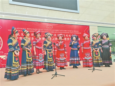在民族文化体验与分享活动环节,广西歌王、广西三月三杂志社总编辑覃祥周和广西女子监狱广西警花歌队开展民族山歌颂歌献党魅力传唱、现场培训和体验分享。民族锦绣绘党恩活动由广西非物质文化遗产项目代表性传承人谭湘光,壮族彩绣技艺传承人、彩绣壮服创始人陆兰珍分别展示壮族织锦、壮族刺绣文化的精湛技艺。民间剪纸感党恩活动由广西工艺美术大师、南宁民间剪纸非遗项目传承人钟昀睿展示民间剪纸文化。这些体验与分享活动,将中华民族优秀传统文化艺术的魅力展现得淋漓尽致,现场观众大呼过瘾。