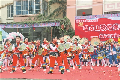 文艺展演中,百人欢唱《广西尼的呀》、学校“壮娃擂鼓队”激情演绎的皮鼓舞、壮乡歌圩对唱《刘三姐》等节目精彩上演。其中,各民族学生代表还用家乡话深情祝福伟大的中国共产党。展演最后,全体师生齐唱《没有共产党就没有新中国》,把活动推向高潮。