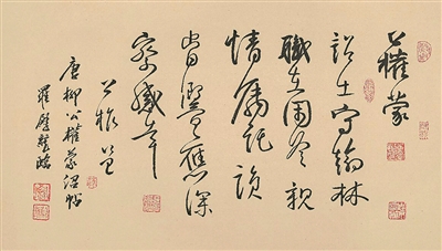 罗殿龙的书房除了书、帖,就是他练习书法的作品,用他自己的话说,他现在除了做一些运动外,多数时间都泡在书房,一为读书,二为研习书艺。书法对他而言是自我提升、修炼的重要手段,他始终保持工作中的一种状态。罗殿龙日常的书法艺术训练始终把临帖当作累积中国传统书法艺术的基本,从而让书写取得较大的稳定的进步。近距离接触这位书法家,他的一堆习书纸堆都是临摹练习,汉、晋、唐、宋、元、明、清各朝代书法大家如苏轼、米芾、黄庭坚、颜真卿等诸多名家作品的品格和风范、韵味都在罗殿龙的临帖里,看到他因为一个字没得原帖之神韵而停笔思索良久,我就深知他今日的书艺的成绩取得有源可索。“久从书法结善缘,临摹古帖笔如椽。挥毫神来钦大雅,怀抱高风有鸿篇。”著名作家、书法家潘琦曾用这首诗来赞扬罗殿龙的刻苦和用心,可谓实至名归。