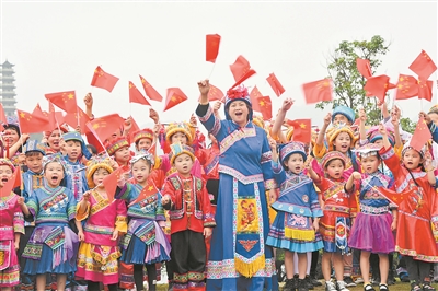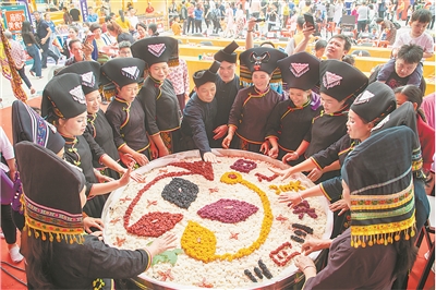 | ▶4月14日,罗城仫佬族自治县举行“仫佬千年、整族脱贫、沐浴党恩、永远幸福”庆祝“三月三”活动,表达了仫佬山乡人民脱贫感党恩、永远跟党走的决心。活动还展示了仫佬山乡的扶贫产品和仫佬族非遗文化,剪纸传承人精心制作了“感党恩 跟党走”的巨幅剪纸作品来表达喜悦之情。(韦如代 摄) |