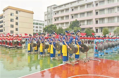 ▲4月12日,巴马民族师范学校举办了主题为“百鼓齐鸣100年赞歌——激情飞扬三月三”的庆祝活动。 大型铜鼓舞《敲起铜鼓谢党恩》是活动的最大亮点。100面铜鼓敲出急密的鼓点,百余名舞蹈演员激情演绎。当豪迈的主题音乐响起,身着艳丽民族服装的演员们在壮语演唱的主题歌和铜鼓的伴奏声中翩翩起舞,表现了壮乡人民过上小康生活的幸福感,道出了对党的感恩之情。