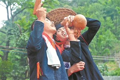 连日来,在巴马瑶族自治县境内瑶族祝著节和建党100周年期间,全县人民均以各种方式庆祝活动,从他们的脸上人们读懂了脱贫后瑶乡人民的幸福生活。图为巴马东山乡两瑶族男子在表演笑酒歌。(梁绍恩/摄)