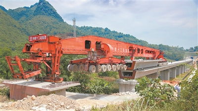 7月17日,随着最后一榀长32米、重800多吨的箱梁稳稳落在桥台上,贵南高铁三标段二分部箱梁架设全部完成,至此,该分部的主体工程实现贯通。该标段位于环江毛南族自治县境内,总长11.3公里,涉及3个隧道及221榀箱梁。贵南高铁全长482公里,是国家“十三五”交通扶贫“双百”工程百项骨干通道工程,也是广西首条时速350公里的高速铁路,其中有57公里线路经过环江毛南族自治县。
