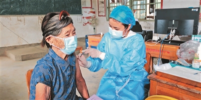 图为九俄瑶寨101岁老人代良枚正在接种新冠疫苗。(兰 堃 /摄影报道)