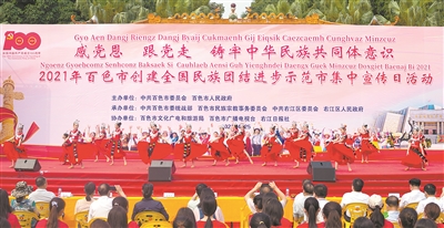 在中华民族共同体意识上再铸牢,共创工作新局。把铸牢中华民族共同体意识教育纳入干部教育、学校教育、社会教育、党史教育的全过程,建立健全制度化、常态化、精准化宣传教育机制,打造以右江区为中心点,以田阳、田东、平果为主线民族团结进步红色之旅示范线,以德保、靖西、那坡为主线的民族团结进步边关永固示范线,以凌云、乐业为主线的民族团结进步文秀品质示范线;以田林、西林、隆林为主线的民族团结进步牵手同心示范线以及百色起义精神弘扬传承宣传教育基地,田阳瓦氏夫人为国抗倭宣传教育基地,平果生态铝工业发展宣传教育基地,靖西对越自卫反击战爱国主义宣传教育基地,乐业“七一勋章”获得者、“时代楷模”黄文秀品质宣传教育基地的“百色市铸牢中华民族共同体意识三带四线五基地”工作新格局。形成以点串线、以线连片、以片带面、点上开花、面上结果的中华民族共同体意识宣传教育新局面,让中华民族共同体意识在壮乡红城百色深深扎根。2021年,全市有1个单位被命名为全国民族团结进步示范区示范单位,6个县(市、区)和45个单位被推荐申报为全区民族团结进步示范区示范单位,159个单位被命名为全市民族团结进步示范区示范单位。