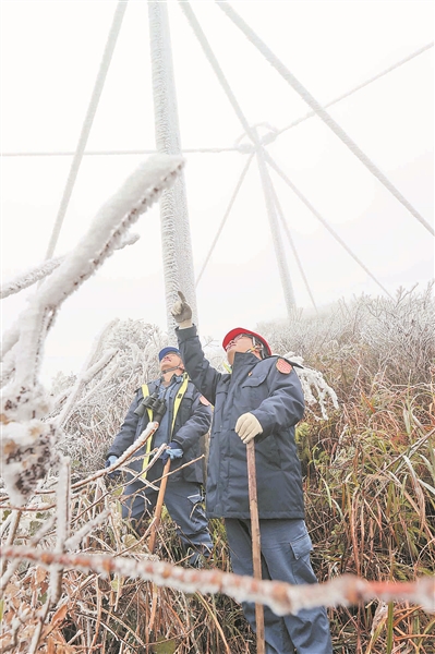 图为12月28日,电力工人在融安县板榄镇东岭村的高寒山区检查电力设施。