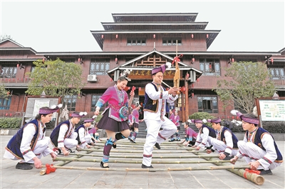 | ▲2月15日,三江侗族自治县侗天宫景区内,游客和演员一同跳起竹竿舞、侗族舞,热热闹闹过元宵佳节。(吴练勋/摄影报道) |