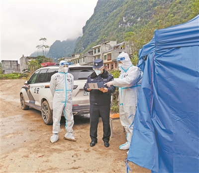 在德保县,黄德阳了解到当地疫情防控形势远比想象中的严峻,他依然没有退缩,始终坚守。为防止人员流动,更好地防控疫情,黄德阳和其他工作队员24小时轮班在疫情防控执勤点上。值守期间天气寒冷,时常伴有大风和降雨,晚上气温经常降至四五度左右,虽然手脚和脸蛋经常被冻得通红,但黄德阳和同事们依然一丝不苟做好车辆巡检等工作。