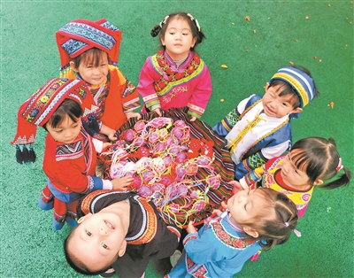 “壮族三月三”期间, 百色市右江区第六幼儿园、区逸夫小学、区第二幼儿园等学校在加强疫情防控的同时,积极开展校园“三月三”民俗活动,老师带着孩子们通过唱山歌、抛绣球、舞龙舞狮、踩高跷、制作五色糯米饭和红鸡蛋等,传承百色民俗文化,弘扬中华民族传统文化,营造浓浓的节日氛围。图为右江区二幼小朋友展示自己亲手做的彩蛋。