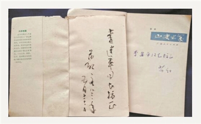 大约是1982年初我刚到广西文联工作不久到他家去看他时,他送给我他的第一本诗集《山欢水笑》,广西人民出版社1979年出版,收入诗作53首。其中《山乡园丁组诗(四首)》《马驮医院组诗(五首)》《三江口问答》等诗颇得赞誉。他在扉页题签:“李建平同志指正 莎红”,没有写年月日。后来,他又出版了一本诗集《边寨曲》,也送给了我。他在扉页题签: “李建平同志指正 莎红 一九八三年五月三十一日”。《边寨曲》是1982年10月由漓江出版社出版,收入诗作65首。韦其麟为其写了题为《写在〈边寨曲〉的前面》的序言,热情赞许了莎红的创作态度和与病魔斗争的战斗精神,称赞“莎红的诗依然充满着青春的激情和热力”,并准确地评论说:“莎红是依靠写真正的民族生活,真实地反映各民族人民的思想情感,依靠他对这些民族的一片真挚的热爱之情,使他的作品具有民族特色的。……对各族人民的热爱和敬重,这恐怕也正是莎红的诗歌创作取得令人赞赏的成绩的一个十分重要的原因。”韦其麟的评论,道出了莎红诗歌的魅力所在。