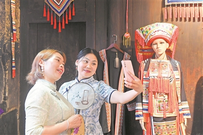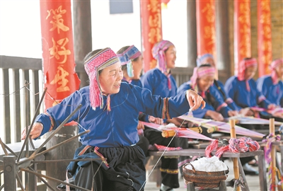 我们来到岔山村中的兴隆风雨桥时,当地村民正在这里为游客表演瑶族传统文化节目,她们一边展示瑶族传统纺织技艺一边欢唱民族歌谣,精彩的表演引来许多游客围观欣赏。