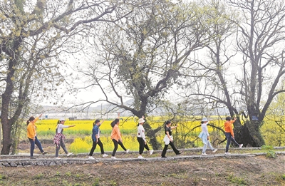 红墙灰瓦外阡陌间,红男绿女欢笑连连,油菜花绽放着融融春光;