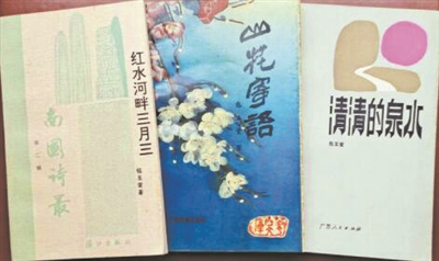 包玉堂与我岳母刘业锦(笔名叶锦)是广西作家协会的同事,也是诗友。我现收藏的包玉堂的签名本,是他赠送我岳母的三本:《清清的泉水》《红水河畔三月三》《山花寄语》。《清清的泉水》是叙事诗集,该书1987年由广西人民出版社出版,收入诗作8首和“前言”,有根据民间传说故事整理、改编的《牛腿琴的传说》《虹》,也有根据革命历史事迹和新时代新生活题材创作的《清清的泉水》《沙妹子的歌声》《少年英雄颂》等,还有一首民间童话诗《小猫和老虎》。包玉堂在扉页题签:“叶锦同志雅正 玉堂 87.11.29”。《红水河畔三月三》是包玉堂在20世纪80年代写的一批诗作的结集,1991年漓江出版社出版。诗作分为“写在桂西老苏区的土地上”“春色满壮乡”“红水河畔三月三”“唱给鞍钢”四辑,收入诗作34首和《自序》。《山花寄语》是散文和散文诗结集,1991年广西民族出版社出版。该书收入散文诗6首,散文23篇,陆地写了序言《涓涓清流——序〈山花寄语〉》。