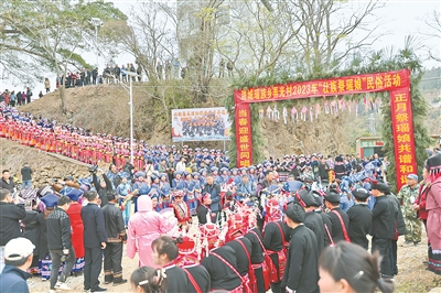 2月15日,田林县潞城乡弄光村敲锣舞狮,迎接宾客,欢度一年一度的传统民俗活动——“祭瑶娘”,各族群众、游客欢聚一堂,共享传统民俗盛宴。