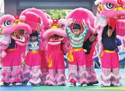 梧州市近年来将舞狮、龙舟、武术、抛绣球等10余项民族传统体育项目融入校园教育,覆盖全市幼儿园、中小学及高校,引导各族青少年在体验中感悟团结协作、爱国奋进的精神内涵,深化“五个认同”,铸牢中华民族共同体意识。图为幼儿园学生在练习舞狮。