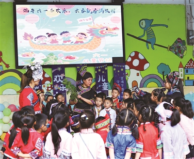 5月30日,在端午节和“六一”国际儿童节接连到来之际,南丹县六寨镇中心幼儿园和苗苗幼儿园分别开展“端午六一齐欢乐”主题活动,各民族小朋友在丰富多彩的民俗体验中深化交往交流交融,感受中华优秀传统文化魅力,共结民族团结情谊,铸牢中华民族共同体意识。图为老师教孩子们认识艾草。(姚姗姗 牙蓓蓓 摄影报道)