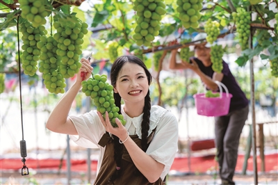 7月9日,游人在梧州市长洲区长洲镇长地村集体经济产业葡萄园采摘葡萄。近年来,长地村党委紧紧围绕“一村一品”党建品牌建设行动,充分挖掘本地特色资源,全力推动特色葡萄种植,扩大“朝阳映鱼乡”党建品牌影响力。利用闲置土地,让“荒地变宝地”的发展思路。村“两委”干部带头组建党员先锋队,联合“党员中心户”和能人志愿者,开展除草、翻耕、土壤改良等攻坚行动。盘活闲置地,激活新动能,让昔日的闲置土地成为集生产、观光于一体的致富园,带动乡村旅游产业发展,促进农民增收致富,助力乡村全面振兴。