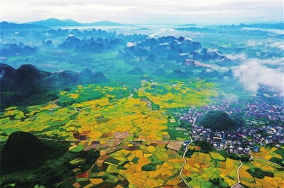 近年来,融水苗族自治县全方位赋能粮食生产,促进农田增产、农民增收、农业增值,助力乡村全面振兴。图为7月24日,该县融水镇东良村成片的优质早稻喜获丰收,金黄的稻田与村落、青山、晨雾等相映成景,构成一幅美丽的乡村振兴“丰”景画卷。