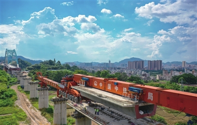 8月17日,岑溪市岑城镇思孟村南珠(南宁—珠海)高铁岑溪段施工现场,建设工人正进行思孟大桥架梁作业。南珠高铁是广西全面融入粤港澳大湾区的重点工程。该项目建成后,将进一步改善桂东地区交通条件,强化粤桂骨干通道功能,推动广西北部湾经济区和粤港澳大湾区“两湾联动”,带动沿线经济发展。