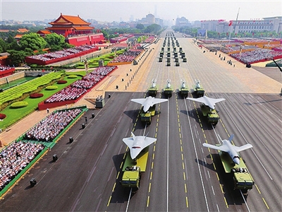 战鹰呼啸,振翅长空。预警指挥机、特种机、运输机、轰炸机、加受油机、歼击机、舰载机等空中梯队依次低空飞过天安门广场,受阅的预警侦察、远程打击、制空作战、战略投送、支援保障等机型,成体系展示我军快速提升的空中作战能力。教练机梯队拉出14道彩烟,寓意着中华民族14年可歌可泣的抗战历程,象征着14亿多中国人民奔向强国复兴的光明前景。