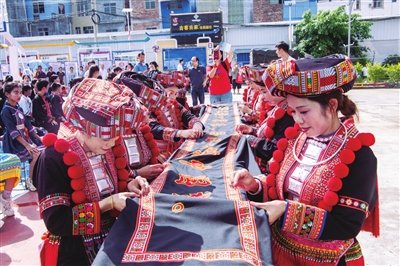 9月18日,田林县利周瑶族乡举行第28届全国推广普通话宣传周活动。现场近千名各族群众通过文化宣传、经典朗诵、百人同书规范字以及“瑶绣推普”等活动,在体验中感受国家通用语言文字对促进民族交往交流交融的重要意义,在互动交流中凝聚民族同心,营造“人人学普通话、人人用规范字”的浓厚氛围。图为瑶绣非遗传承人将推普标语融入创作中。(姚伦伸 摄影报道)