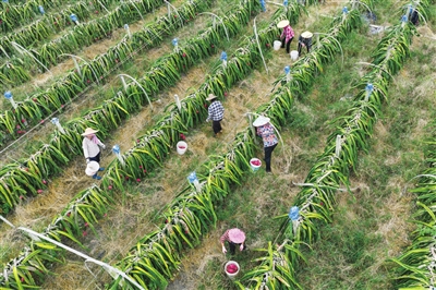 国庆节和中秋节来临之际,在蒙山县文圩镇屯治村的火龙果种植基地里,村民们正忙着采摘、装运火龙果,以供应市场。忙碌的采摘现场呈现出一派喜人的丰收景象。图为村民在采摘火龙果。