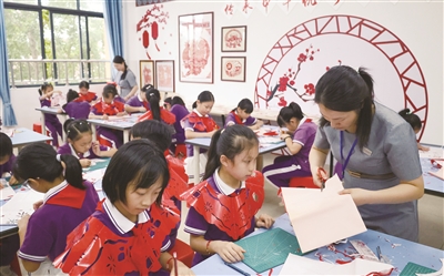 ① 9月24日下午,学校铸牢中华民族共同体意识“开学第一课”系列活动在八步区城东实验小学举办。手工课堂上,学生们聚精会神学习剪纸。