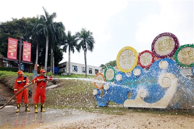 ⑨ 消防救援人员正在用高压水枪清理淤泥。