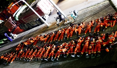 ⑧ 轮换期间消防救援人员躺在地上休息。