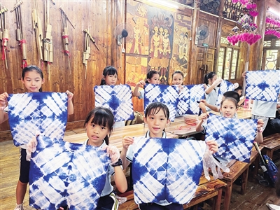 非遗扎染手工体验环节,更是让同学们沉浸其中、兴致盎然。工作人员详细讲解扎染的历史、工艺与操作技巧,还示范绑、扎、染等关键步骤。同学们认真学习,拿起白布、绳子和染料发挥创意,尽情创作。北站路小学二年级 2 班的韦璟玥同学兴奋地说:“扎染过程好玩,每块布纹样独一无二,我要送给妈妈,告诉她这是我做的非遗扎染。”