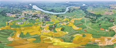 金秋时节,位于红水河畔的来宾市兴宾区大湾镇的晚稻和糖料蔗进入丰收季节,金色的稻田稻谷飘香,与随风翻涌的绿色蔗海相映成景,构成一幅宜居康寿美丽家园的金秋画卷。图为11月2日拍摄的大湾镇凌仑村田园景象。