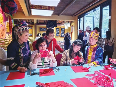 11月15日,“2025年海外媒体河池行”活动走进罗城仫佬族自治县。本次活动由河池市与中国新闻社广西分社联合举办,邀请来自印度尼西亚、泰国、老挝、澳大利亚等国家(地区)的21家海外媒体记者齐聚罗城,开启一场仫佬文化体验之旅。他们以镜头定格山水美景,用文字书写见闻感受,深入探访罗城独特的民族风情、蓬勃发展的乡村产业,以及旅游发展推动各民族交往交流交融的生动实践。图为海外媒体记者体验非遗剪纸。
