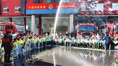 正值全国消防宣传月,11月25日,来宾市消防救援支队翠屏路特勤站举办消防站开放日活动。市第一实验幼儿园300余名小朋友走进消防站,零距离探秘“火焰蓝”的工作日常,在趣味互动中了解消防知识,筑牢安全意识。图为消防员为小朋友展示水枪出水。