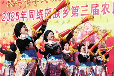 祭祀礼成后,文艺表演精彩纷呈。国家级非物质文化遗产瑶族长鼓舞铿锵激昂,将瑶族人民的豪迈与文化底蕴展现得淋漓尽致;原生态侗族琵琶歌谣婉转悠扬,琴弦轻拨中唱出对美好生活的憧憬与赞颂;同练瑶族乡与贵州水族同胞联袂演绎的水族铜鼓舞,雄浑鼓点穿越地域界限,既彰显了水族“以鼓传情”的非遗魅力,更让现场观众深切感受到黔桂各民族文化交融共生的独特韵味。