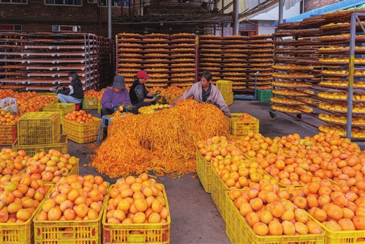 时下,平乐县二塘镇牛角村种植的柿子迎来丰收,当地果农趁着晴好天气采收柿子、加工柿饼,供应市场,助力乡村振兴。图为果农将柿子去皮。