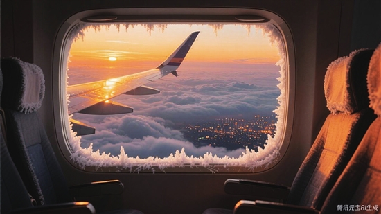 又一阵颠簸,我的右手无意间触碰到机窗的玻璃,冰冰的,比在地面上触摸它时的温度要冷得多。我仔细地打量着玻璃,发现外层的玻璃底部边缘地带长出了一朵小小的冰花。刚开始,它像萌芽的蘑菇头,又像紧紧握在一起的小拳头,随着飞机往北,如有生命力催促着它在玻璃上生长。一段时间过后,它在玻璃的左下角上开出一朵美丽的冰花。