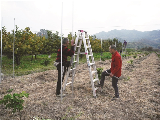 时值冬季,在恭城瑶族自治县恭城镇乐湾村的田间地头,农户们正抢抓农时,为新栽的无核黄皮果苗培土浇灌和搭建过冬的保暖大棚。