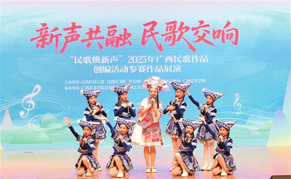 12月17日晚,“新声共融·民歌交响——‘民歌焕新声’2025年广西民歌作品创编活动参赛作品展演”在广西艺术学院南湖校区音乐厅举行。各界嘉宾、创作者代表、演职人员及各族师生、群众齐聚一堂,共同见证这场传统与现代交融、民族与时代共鸣的民歌盛宴。图为展演节目《家乡的小百灵》。
