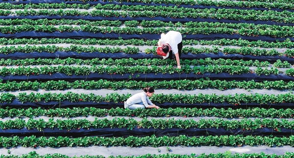 近日,在梧州市万秀区龙湖镇高旺村的草莓种植基地,游客正在地间采摘成熟的草莓。秋冬时节,梧州市积极引导农民开发秋冬种农作物助农增收。今年全市秋冬种农作物超110万亩。图为游客在摘草莓。(颜桂海 摄影报道)